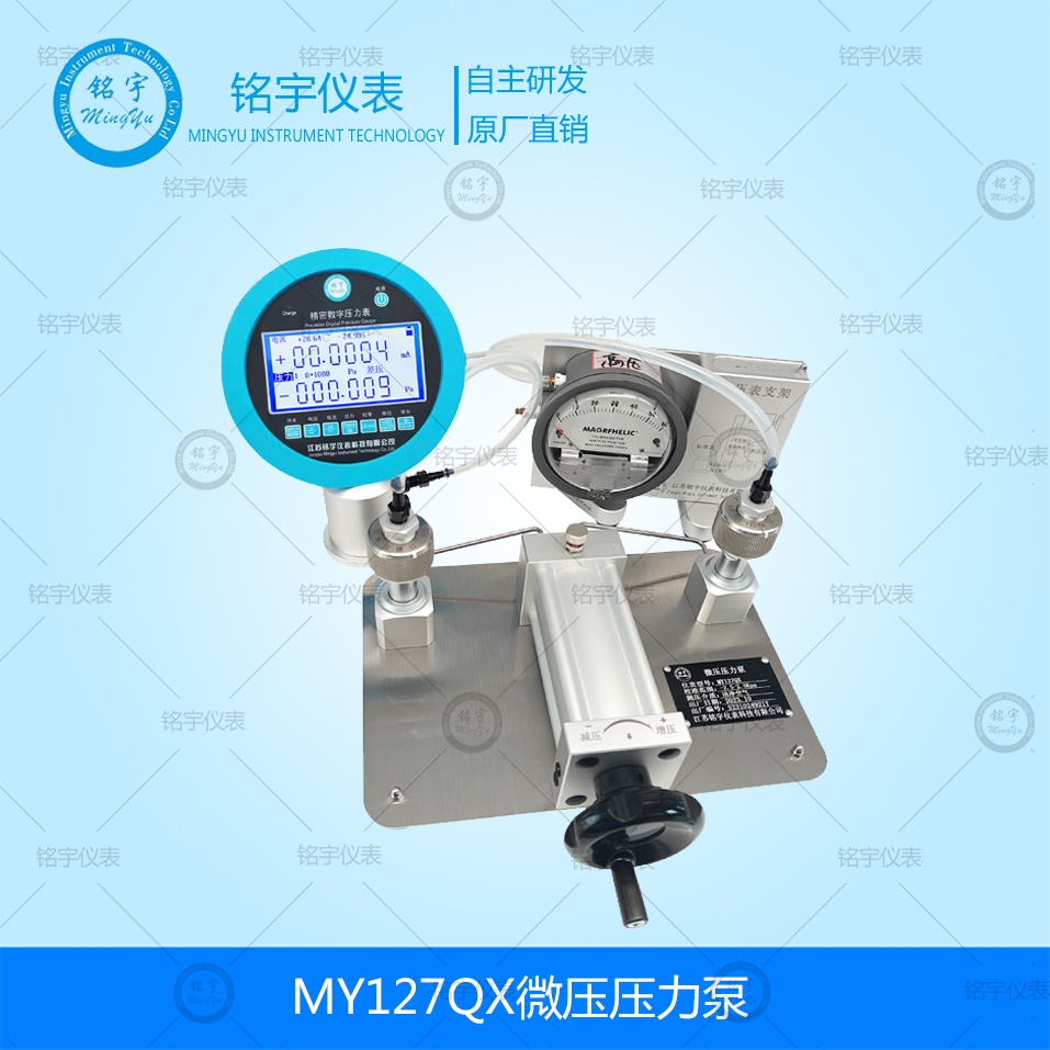 MY127QX微压压力泵(以下简称气压校验装置)是压力仪表检测工作中的重要辅助设备,与压力标准器配合使用,完成压力仪表校准、检测工作。微差压表校准仪发生器选用优质气压泵作为压力发生部件,辅以设计精巧的微调、快速接口、稳压阀组成。操作简单、结构合理、密封性能良好的优点,宽范围压力发生系统,可广泛应用于计量、科研、工矿企业。微压压力泵适宜于:在校验压力变送器、压力传感、精密(普通)压力表等其它压力仪器仪表时提供稳定、快捷、安全可靠的超高压压力源。主要用于化工、电力、食品卫生、航空航天、军工、冶金、计量等行业。 微差压力泵仪技术指标 1、压力范围:±500Pa;±1000Pa;±2000Pa;±2500pa;±3000pa;±5000Pa;0-1000Pa;0-5000Pa;±5kpa;±6kpa ;±10kpa更多压力联系客服.当光标处于压力测量项时该键为压力单位选择, 重复按该键可在PSI、inH20、i n Hg、mbar、bar、mmH2O、mH2O、Pa、hpa、mmHg、kgf/cm2、kPa (MPa)之间循环切换。 2调节灵敏度:min 0.1 Pa 3精度:0.05%F.S,0.02%F.S 3工作温度:-10~60℃ 湿度:100% 4重 量:约1.5kg 微压压力泵使用操作 1.正压检测 拧下输出1、输出2接头上的堵头,将微调调至 适当位置(微调向外摇出)。打开过压稳压阀、关闭截止阀。再分别安装正压标准表和被检表在两个压力输出接口上,用微调向里调的升压至检定点左右时,稳定1~2分钟,等标准表显示数字稳定时,再使用微调调至检定点,逐点检测至满量程。校验完毕,打开截止阀。当加压中发现读数慢慢向下跌时(有轻微泄漏)请关闭稳压阀。 2.微压压力泵负压检测 分别在两个压力输出接口上安装负压标准表和被检表,将微调向里摇进(觉得摇不动时)。请先关闭截止阀,打开稳压阀。慢慢讲将微调向外摇出到检定点左右时稳定1~2分钟,等标准表显示数字稳定时,再使用微调调至检定点,逐点检测至满量程。校验完毕,打开截止阀,当加压中发现读数有轻微泄漏请关闭稳压阀。 微压压力泵注意事项 1、发生器应选择平整易操作的台面放置,避免进入有高腐蚀性气体及粉尘颗粒的环境中使用。 2、被检仪器应作适当清洗,避免污渍进入检测回路。 3、输出1、输出2接嘴为专用快速接头,端面密封。 4、输出1、输出2接嘴为上下两件组成,使用时应经常检查下部锁紧螺丝是否连接可靠,若连接不可靠,在遇高压情况下,可能造成崩脱。 4.5当杠杆造压较重时,请使用微调升压,则较为轻松。 安装仪表时,无需借助任何工具,均匀用力拧紧,大概在密封面相互贴紧时,再拧1~2圈,即可。 微压压力泵各部件名称及功能 编号 | 名 称 | 功 能 | 1 | 泵体总成 | 各部件组合安装 | 2 | 输出 1 | 连接标准表或被检表 | 3 | 输出 2 | 连接标准表或被检表 | 4 | 稳 压 阀 | 输出压力不稳定时锁定,可保持压力平稳 | 5 | 截 止 阀 | 造压时锁定,回压时开启 | 6 | 微 调 | 通过操作带动活塞柱运动 |
